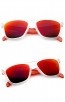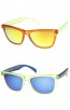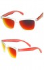 Modified horn rimmed sunglasses that features a two-tone frosted frame, color mirrored lens and keyhole nose bridge for a better fit. Available in a variety of fresh colors for the warm and sunny season. Made with an plastic based frame, metal hinges and UV protected polycarbonate lens.