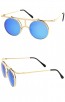 Stand out from the crowd in these eye-catching round sunglasses featuring a flip-up lens cover design with stunning colored mirror lenses and clear lenses. Complete with a flat top and ultra slim arms for a sleek look, these bold sunglasses are perfect for music festivals. Made with a metal based frame, English style nose pieces, metal hinges, and 100% UV protected lenses.