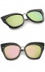 Bold and stylishly chic, these exaggerated cat eye sunglasses are exquisitely designed with contrasting metal trim around the lenses, a slim nose bridge, and thin temples. Stunning colored mirror flat lenses complete this ultra-luxurious and feminine style. Pair it with your favorite outfits for a stand out look. Made with a metal and plastic based frame, English style nose pieces, metal hinges, and reflective UV400 protective lenses.